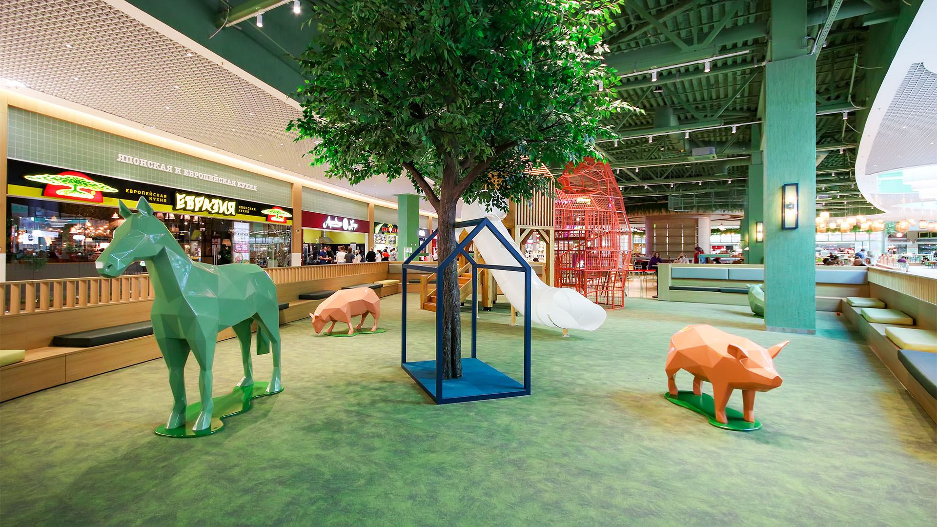 Прекрасные новости для детей и родителей! В детской зоне нашего Фуд-парка открылась детская площадка. Здесь есть все что нужно: забавные фигуры зверей, классическая деревянная горка, лазалки и достаточно места, чтобы просто побегать.
